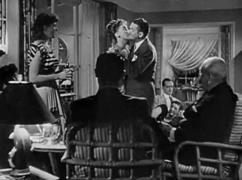 這是Alicia的負責人,招募人,以及之後的愛人Devlin首次出現的場景。鏡頭在Devlin背後,因從兩邊的打光導致他的背影是完全黑暗的,代表著他的神祕性以及不可接觸性。但是,低仰角的鏡頭又有著被征服的含意。也就是說,他已經在這一刻被女主角的魅力所征服了。在這一幕中,由於Alicia的父親剛被定罪,她邀請許多朋友來到她家喝酒玩樂以忘記所有的不愉快。